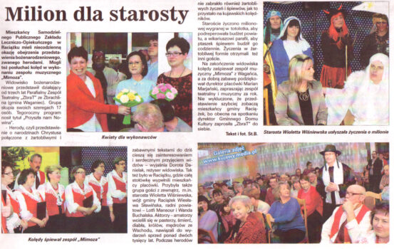 W dniu 11.01.2014r. Zakład gościł zaprzyjaźnionych artystów z grupy teatralnej ZbraT oraz zespółu Mimozy. Wśród zaproszonych gości można było zobaczyć: Starostę Panią Wiolettę Wiśniewską, ks. Pawła Osińskiego z Ciechocinka, Panią Wójt Wiesławę Słowińską, Panią Wandę Buchalską oraz Panów Lotwiego Monsour i Bartosza Różańskiego. Pomysłodawcą i reżyserem przedstawienia jest Pani Dorota Danielak.